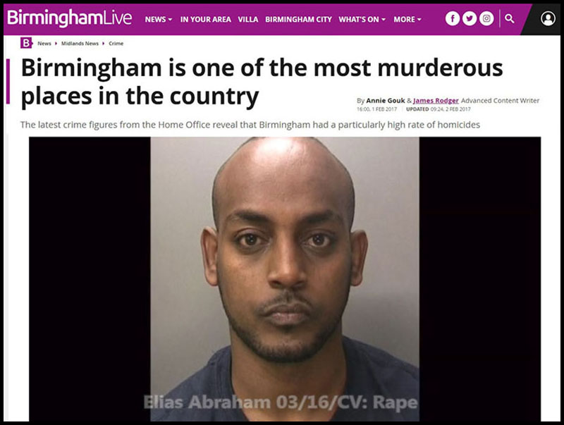 According to that newspaper, crime figures from the Home Office revealed that “Birmingham had a particularly high rate of homicides, attempted murders and conspiracies to murder in the 12 months up to October 2016.”