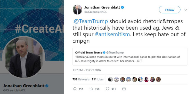 “Jonathan Greenblatt is trying to connect the hatred and bigotry of some despicable individuals with the movement to Make America Great Again that Mr. Trump is leading. Note that, in his recent comments, Jonathan Greenblatt did not dispute Mr. Trump’s description that Secretary Clinton is at the heart of a global power structure that has stripped the United States of its wealth to line the pockets of corporate and political interests.”