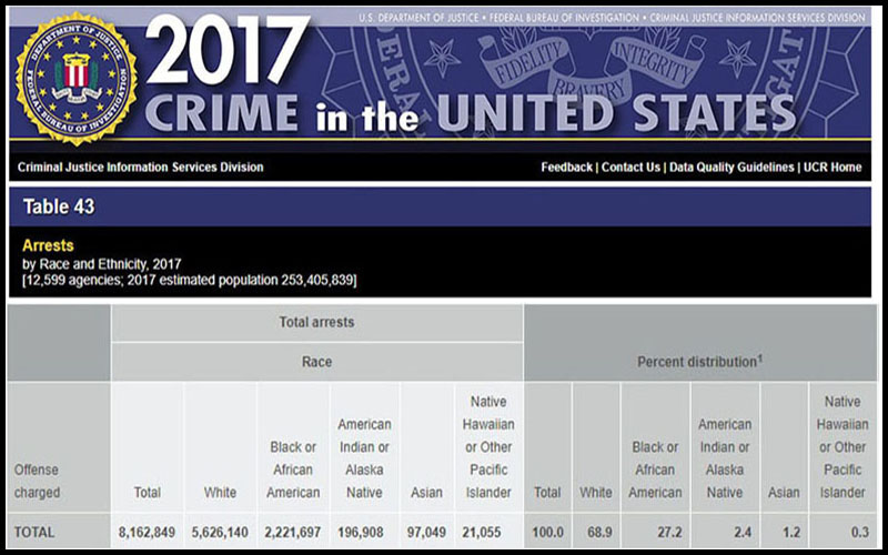 Then the FBI figures go on to claim that “In 2017, 68.9 percent of all persons arrested were White, 27.2 percent were Black or African American, and the remaining 3.9 percent were of other races.”