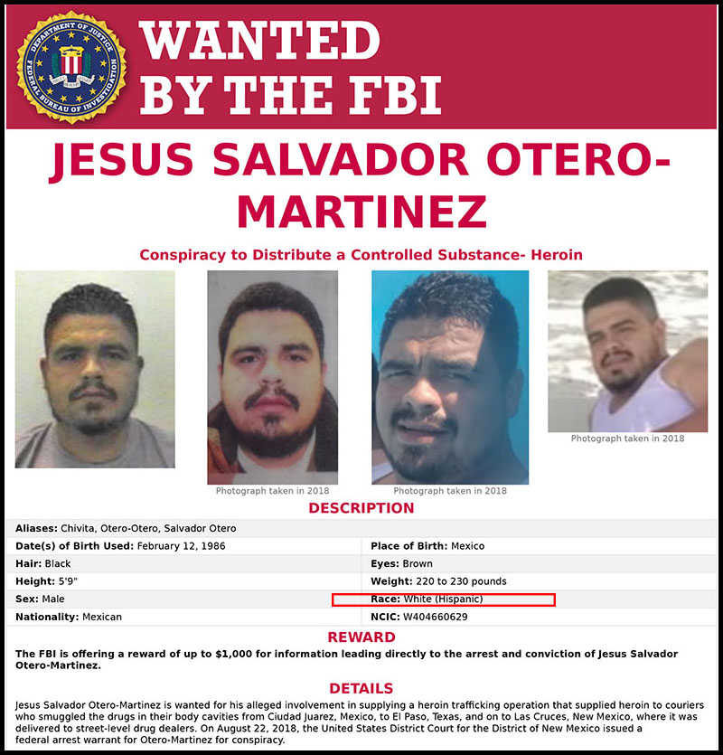 Otero-Martinez was born in Mexico, and by his physical appearance is obviously a mixed race individual—but the FBI poster classifies him as “Race: White (Hispanic).”