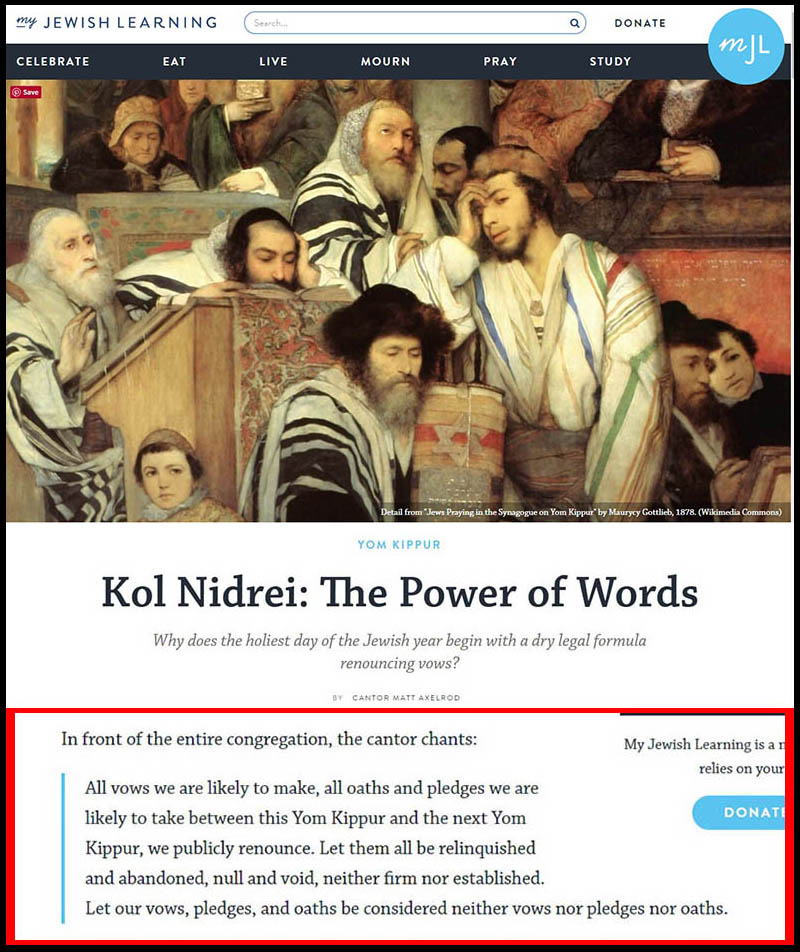 If any other religion had such a prayer—and blanket absolution to break vows and promises—Jewish lobbies such as the Anti-Defamation League, the SPLC, the World Jewish Congress and many others—would complain bitterly about it, and the Jewish lobby controlled mass media would be relentlessly attacking this ceremony as “evil” or “hate”—but because it is Jewish, the Kol Nidrei prayer is simply ignored.