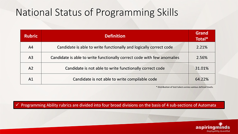 - “Lack of adequate knowledge to build a logically correct, maintainable code is the key reason for low employability.