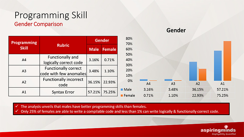 The report concludes that “Only 25% of [Indian] females are able to write a compilable code and less than 1% can write logically & functionally correct code.”