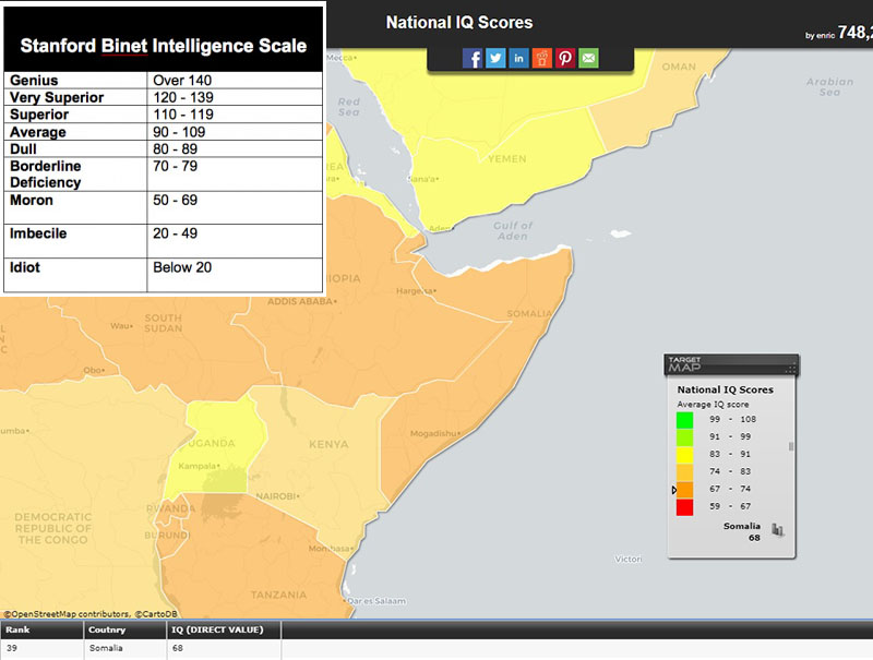 “…Somalia has an average IQ of 68, which places Somalis into the “Borderline Deficiency” category of the official Stanford-Binet scale of intelligence.” No, according to your infographic, an average IQ of 68 places them in into the “Moron” category of the official Stanford-Binet scale of intelligence.