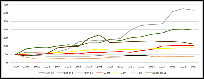 In Guatemala, there has been “more consistent production growth among its top crops, such as coffee, bananas, palm oil, sugar, corn, rice, and beans.