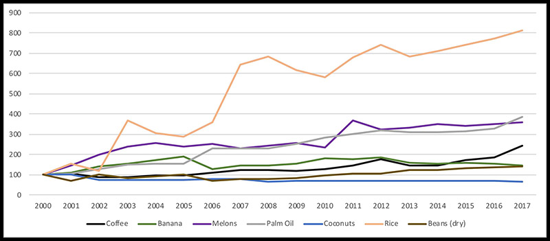 “Of those crops, only coffee and rice declined, and the coffee declines were very slight, with production relatively unchanged in the past decade, due to increased global competition. Rice fell sharply in the early 2000s, but production has steadily climbed back since, reaching nearly pre-2000 levels of 33,000 metric tons.