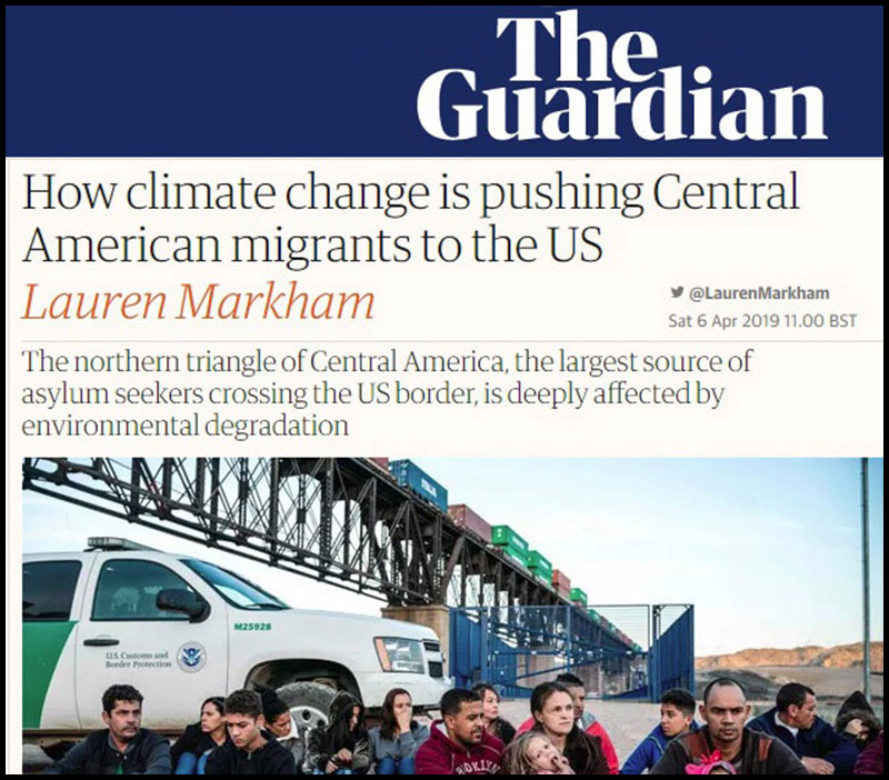 The UK’s far left Guardian newspaper, for example, recently carried an article (“How climate change is pushing Central American migrants to the US,” 6 Apr 2019) which claimed that the “northern triangle of Central America, the largest source of asylum seekers crossing the US border, is deeply affected by environmental degradation” and that “much migration from Central America and, for that matter, around the world, is fueled by climate change.”