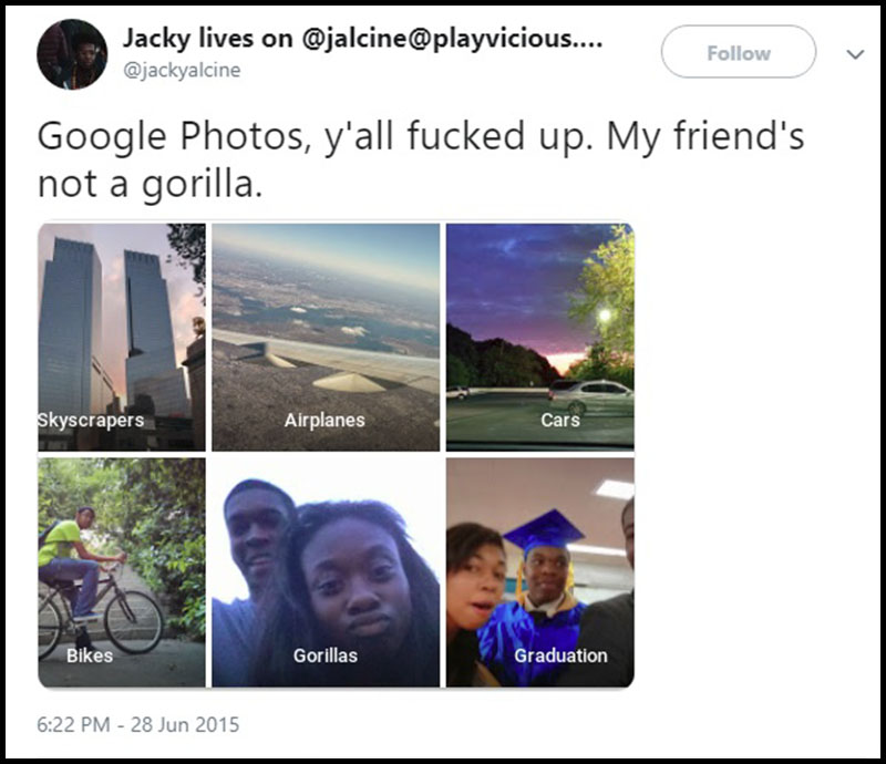 In 2018, Google admitted that it had been unable to solve the auto-identification of black people as “gorillas,” and had therefore resorted to simply preventing Google Photos from ever labelling any image as a gorilla, chimpanzee, or monkey – even pictures of the primates themselves.