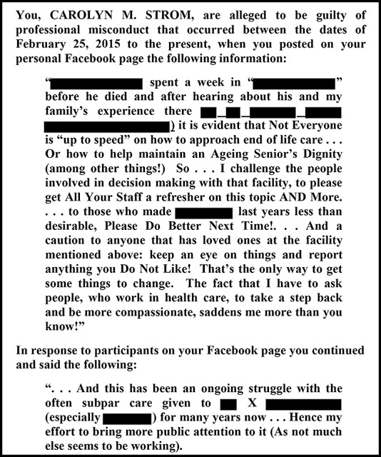 Her crime was to make a Facebook post in February 2015 about end-of-life care on her personal Facebook page where she commented about the “subpar care” her grandfather had received at a Macklin health facility.