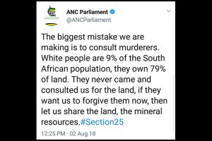 South Africa’s ruling African National Congress (ANC) has been forced to delete a Twitter message which called all whites in that country “murderers” and demanded the seizure of all land and minerals... Read more »