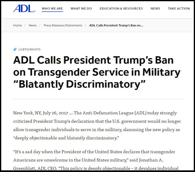 The hypocritical Jewish Supremacist Anti-Defamation League (ADL) has blasted Donald Trump’s banning of mentally ill “transgenders” from the U.S. military—but is steadfast in its support for the Jews-only state of Israel, which has outlawed homosexual marriage and all “LGBT” rights.