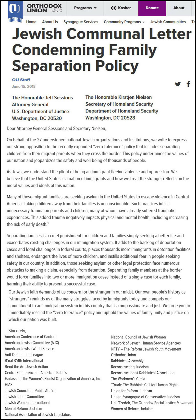 The letter was signed by the American Conference of Cantors, American Jewish Committee (AJC), American Jewish World Service, Anti-Defamation League, B’nai B’rith International, Bend the Arc Jewish Action, Central Conference of American Rabbis, Hadassah, The Women’s Zionist Organization of America, Inc., HIAS, Jewish Council for Public Affairs, Jewish Labor Committee, Jewish Women International, Men of Reform Judaism, National Association of Jewish Legislators, National Council of Jewish Women, Network of Jewish Human Service Agencies, NFTY – The Reform Jewish Youth Movement, Orthodox Union, Rabbinical Assembly, Reconstructing Judaism, Reconstructionist Rabbinical Association, The Workmen’s Circle, T’ruah: The Rabbinic Call for Human Rights, Union for Reform Judaism, United Synagogue of Conservative Judaism, Uri L’Tzedek, The Orthodox Social Justice Movement, and the Women of Reform Judaism.