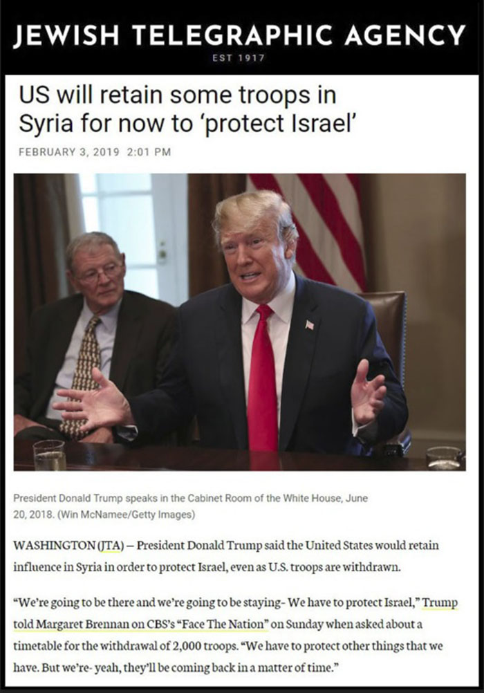 Meanwhile, just to emphasize that this Jewish-lobby triple-prong move to control the US Congress works without fail, Trump announced that American soldiers would “retain some troops in Syria to protect Israel.”