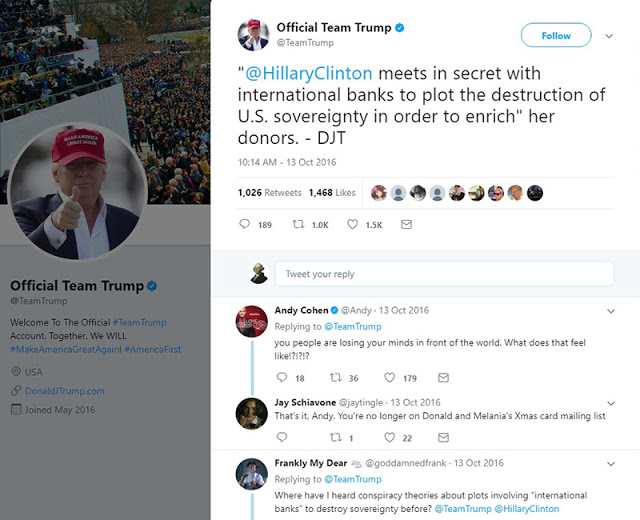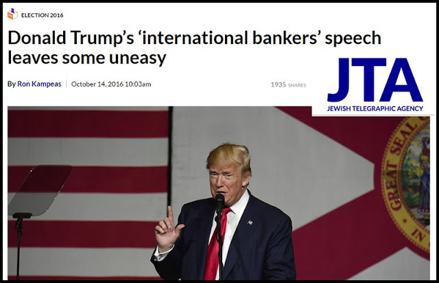 The JTA went on to admit that Trump “never mentioned Jews in his prepared text, which he read from teleprompters with some extemporization,” but that merely referring to “a vast conspiracy involving scads of money and ‘international banks,’” he was entering a territory “where hostility to Jews perpetuates and thrives even in their absence.”