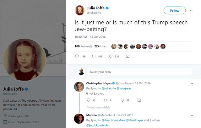 Next to identify the comments as “anti-Semitic” was Jewish journalist Julia Ioffe—who had earlier penned a lie-filled smear article on Trump’s wife Melania in GQ magazine.