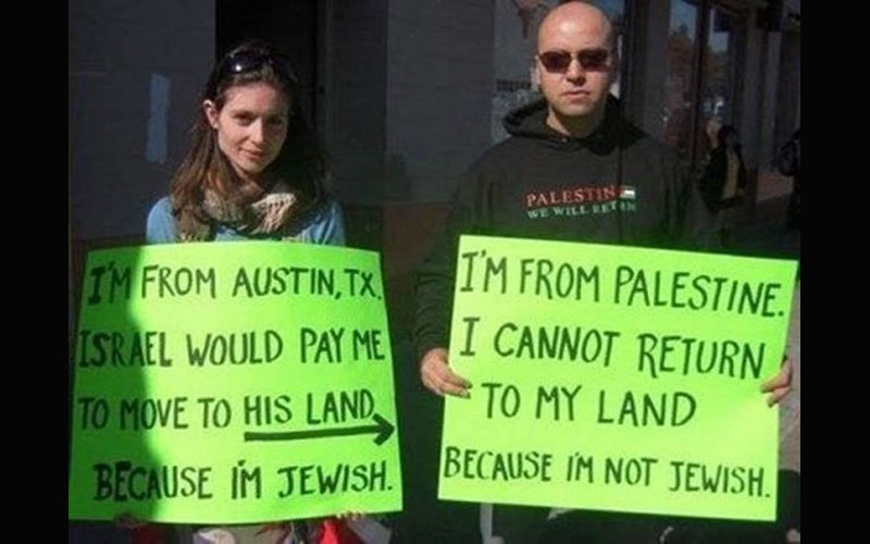 Weiss then used an old illustration of a Jewess and a Palestinian demonstrating Israel’s racially-based immigration laws: “As the illustration above makes plain, any Jew can move to Israel tomorrow; but a Palestinian who was born there and made a refugee by the Jewish state is not allowed to return to his or her own village.”