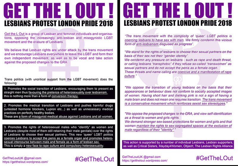 A leaflet handed out by the group said that they opposed the “increasingly anti-lesbian and misogynistic LGBT movement and the erasure of lesbians” and that “lesbian rights are under attack by the trans movement and we encourage lesbians everywhere to leave the LGBT and form their own independent movement.”