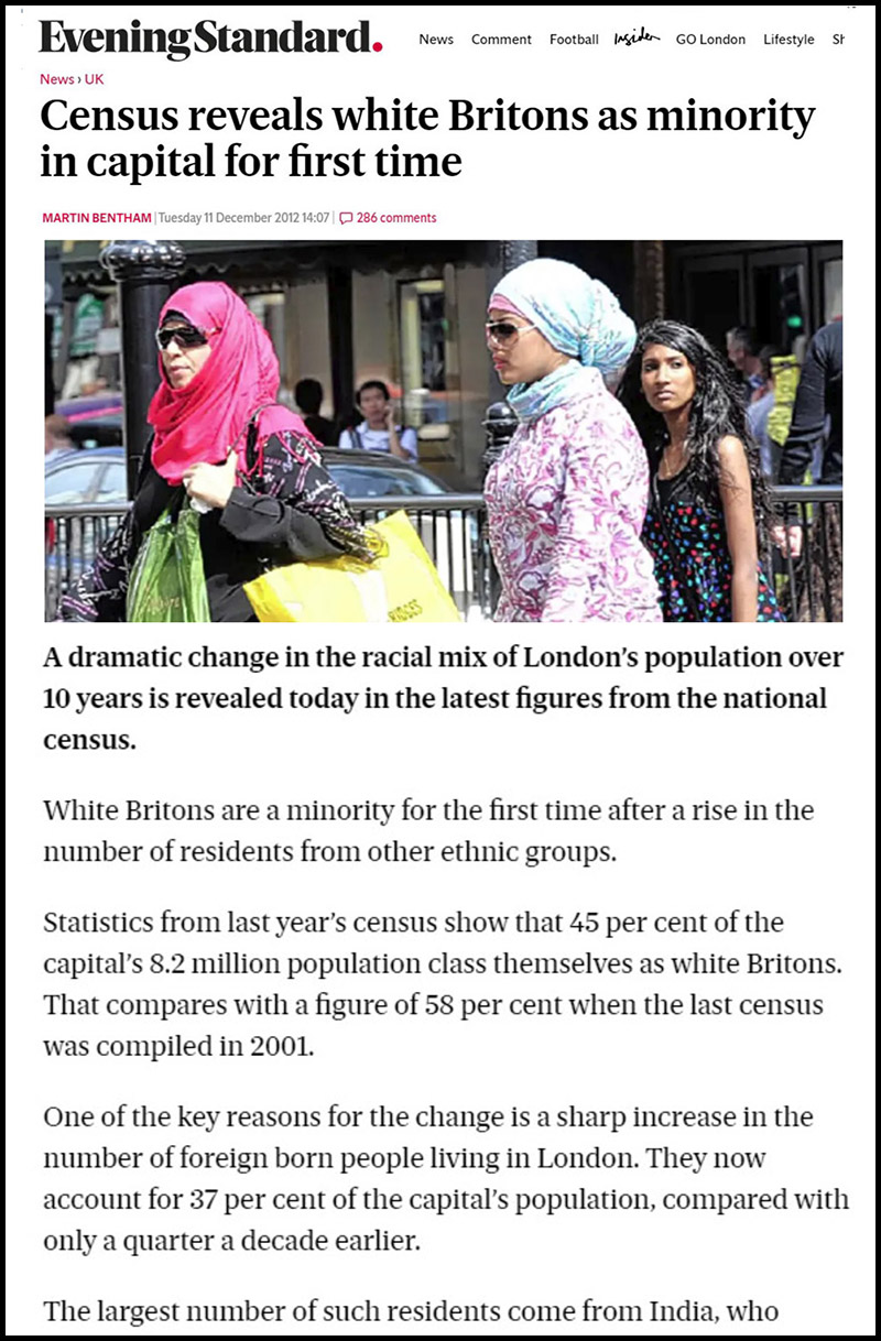 London became majority nonwhite in 2010, according to the 2011 census, and the clear link between the slide into a majority Third World population and the staggering increase in crime is obvious to all but the willingly blind.