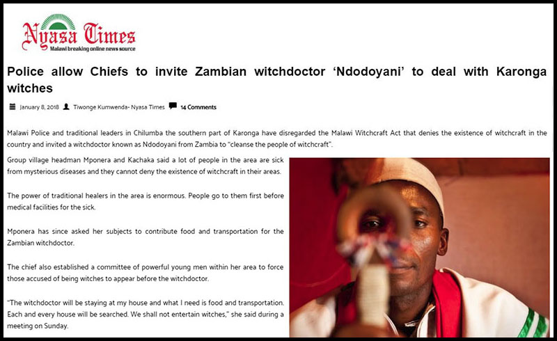According to the Malawian newspaper, the police “have disregarded the Malawi Witchcraft Act that denies the existence of witchcraft in the country and invited a witchdoctor known as Ndodoyani from Zambia to ‘cleanse the people of witchcraft.’”