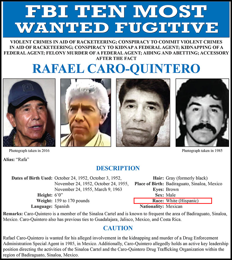 Also born in Mexico, Caro-Quintero is listed on his wanted poster as “Race: White (Hispanic).”