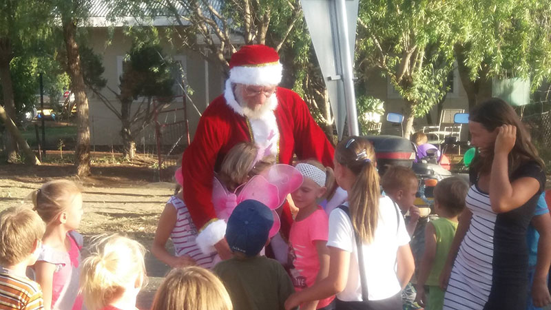 Father Christmas visited the Orania suburb of Kleingeluk early in December and made the children happy by giving presents to everyone. He and his entourage arrived by quad bike and were welcomed enthusiastically by the children, who also sung Christmas carols and heard the Christmas story.