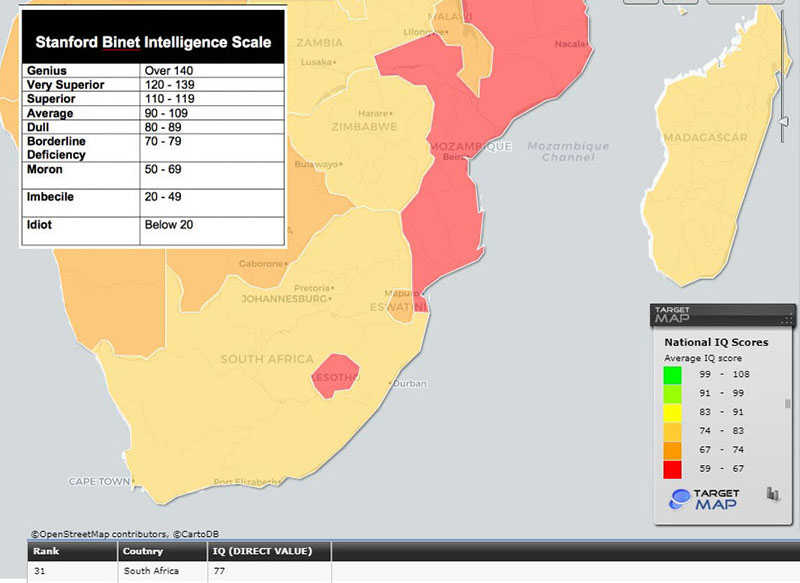 * South Africa has an average IQ of 77, a fact which race-denying liberals ignore—and are then at a loss to explain why South Africa is collapsing.