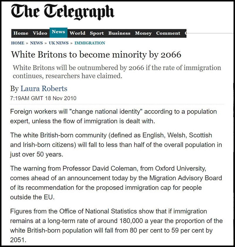 As reported by Professor David Coleman, figures from the Office of National Statistics (ONS) show that “at current immigration levels” (that was written in 2010), the proportion of the white British-born population will fall from 80 percent to 59 percent by 2051.