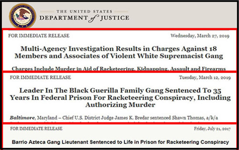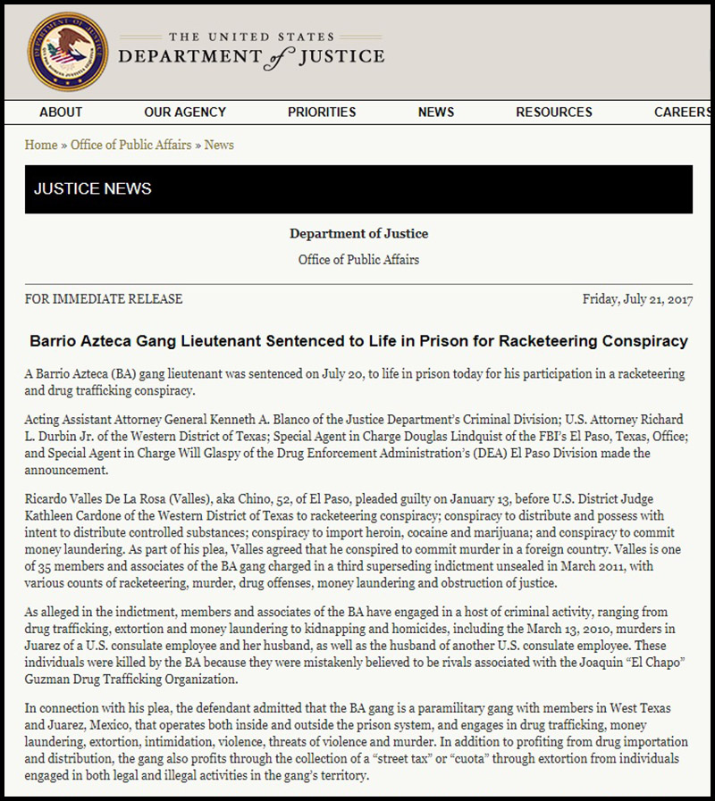 Another example of this tactic can be seen in a July 21, 2017 press statement from the DOJ, detailing the sentencing of a senior member of the “Barrio Azteca” gang to prison.
