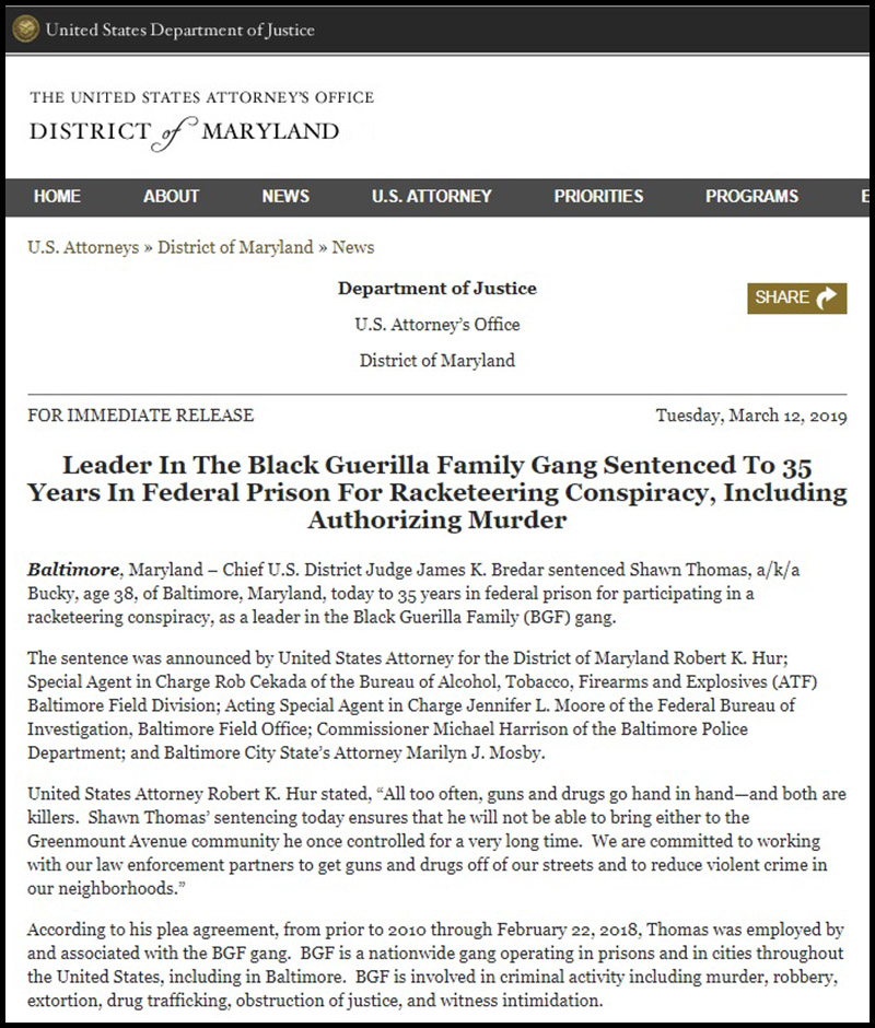 The second DOJ press release, issued on March 12, 2019, headlined “Leader In The Black Guerilla Family Gang Sentenced To 35 Years In Federal Prison For Racketeering Conspiracy, Including Authorizing Murder,” detailed the sentencing of Shawn Thomas, a/k/a Bucky, age 38, of Baltimore, Maryland, to 35 years in federal prison for participating in a racketeering conspiracy, as a leader in the Black Guerilla Family (BGF) gang.