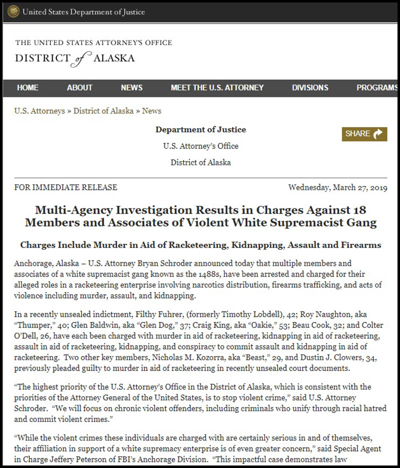 “While the violent crimes these individuals are charged with are certainly serious in and of themselves, their affiliation in support of a white supremacy enterprise is of even greater concern,” said Special Agent in Charge Jeffery Peterson of FBI’s Anchorage Division—in other words, the vicious crimes these criminals committed is not as important as the fact that they used names such as “Filthy Fuhrer” or “1488.”