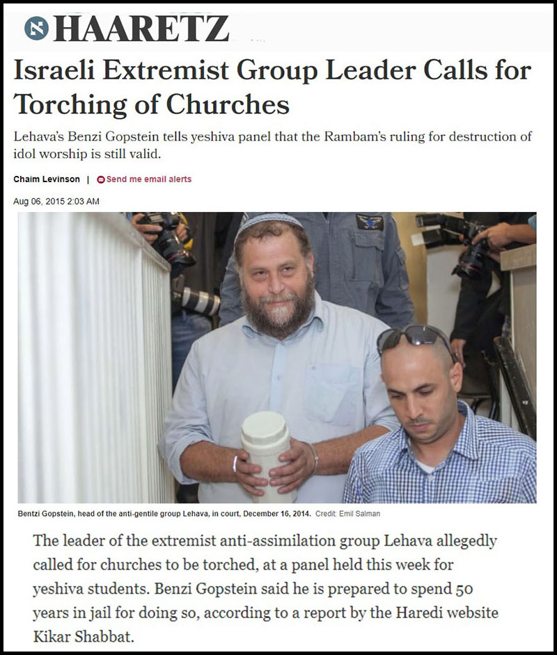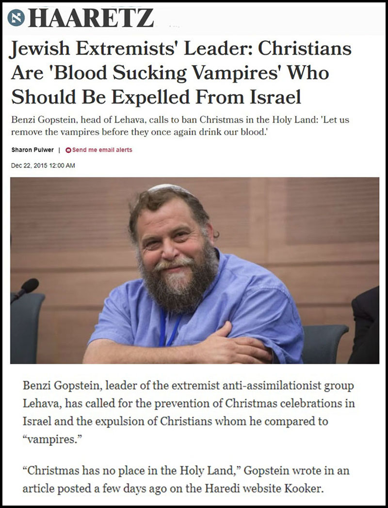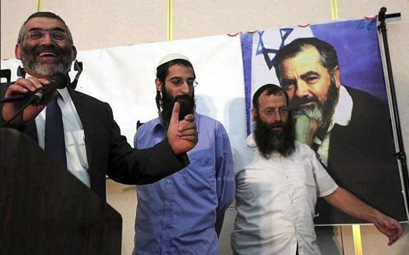 Above: Netanyahu’s election alliance partner, Otzma Yehudit (“Jewish Power”) party leader Michael Ben Ari, (left) speaks during a ceremony honoring Kach leader Rabbi Meir Kahane in Jerusalem.