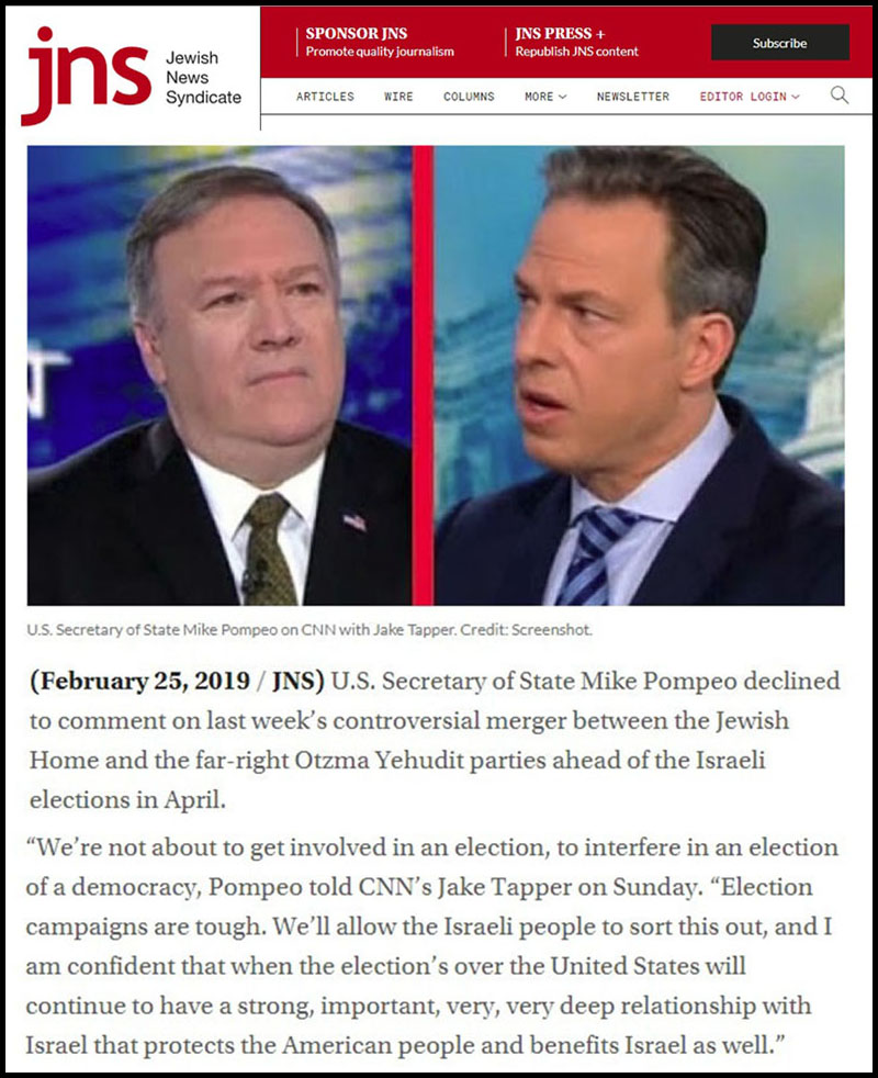 US Secretary of State Mike Pompeo has announced a visit to the Jews-only Israel to show “unwavering support” for Benjamin Netanyahu—despite the latter’s electoral alliance with the Jewish Power party whose leaders seek to expel all non-Jews and regard Christians as “blood sucking vampires.”