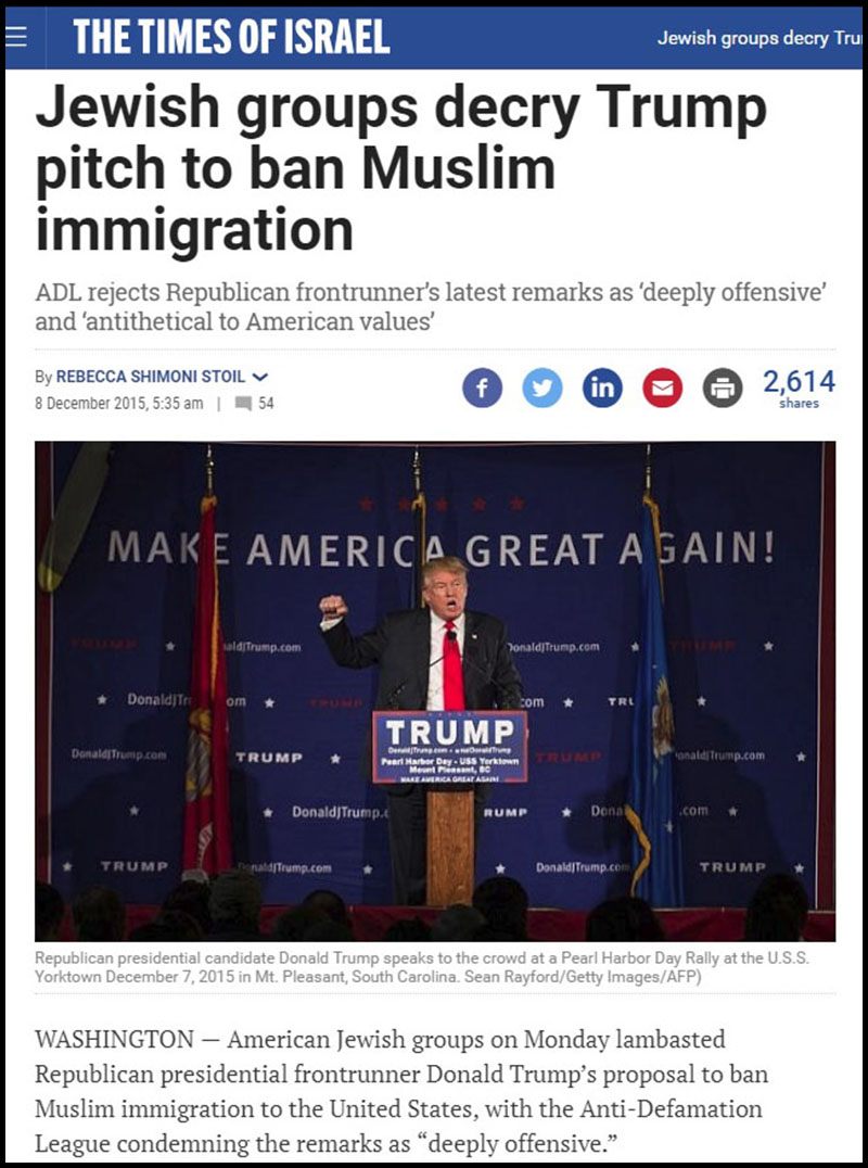 A report in the Times of Israel from December 2015, for example, said that “American Jewish groups,” including the ADL, the American Jewish Committee, the Religious Action Center of Reform Judaism, the Interfaith Alliance, and others, all announced their vehement opposition to then presidential candidate Donald Trump’s suggestions that Muslim immigration into the US be halted.