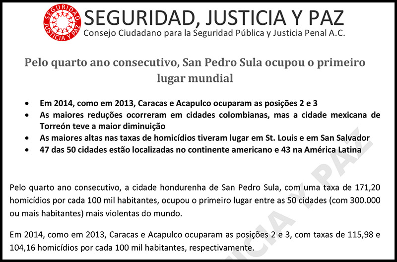San Pedro Sula in the South American state of Honduras kept its title as the most murderous city on earth for the fourth year running, with a homicide rate of 171.20 per 100,000 inhabitants.